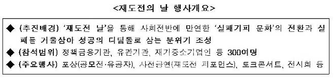 중기청 관계자는 “이번 행사를 통해 ‘재도전의 사회적 가치’ 및 ‘실패의 자산화’에 대한 범국민적 공감대를 형성할 것으로 기대한다”며 “앞으로도 실패·재도전에 대한 관대한 문화정착과 재도전 활성화를 위해 지속적인 노력을 전개할 계획”이라고 말했다.
