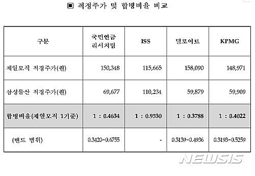 삼성이 지난해 7월 17일 1대0.35의 비율(삼성물산 1주당 제일모직 0.35주)로 합병한 것을 두고 각종 논란이 일고 있는 가운데 당시 외부 회계법인들은 이보다 높은 1대0.37, 1대0.40을 제시했던 것으로 드러났다. 당시 소액주주와 외국인 투자자들은 제일모직과 삼성물산 간 합병비율(1대0.35)이 삼성물산에 현저하게 불리하게 책정됐다고 합병 철회를 요구했지만 국민연금이 삼성 손을 들어준 게 결정적으로 작용해 가까스로 합병이 성사됐다.