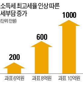 이로써 연 소득 5억원 초과자의 세 부담은 세법 개정안이 적용되는 내년부터 크게 늘어난다. 연 6억원 소득자의 경우 세 부담은 올해보다 200만원, 8억원 소득자는 600만원, 10억원 소득자는 1000만원 증가한다.