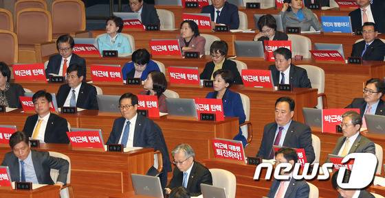 (서울=뉴스1) 박상휘 기자,김영신 기자 = 야당들이 공조해 박근혜 대통령 탄핵소추안을 제출한 3일 여야는 입장차를 확인하며 공방을 벌였다. 국회에서의 탄핵안 처리에 극심한 진통이 예고된다.