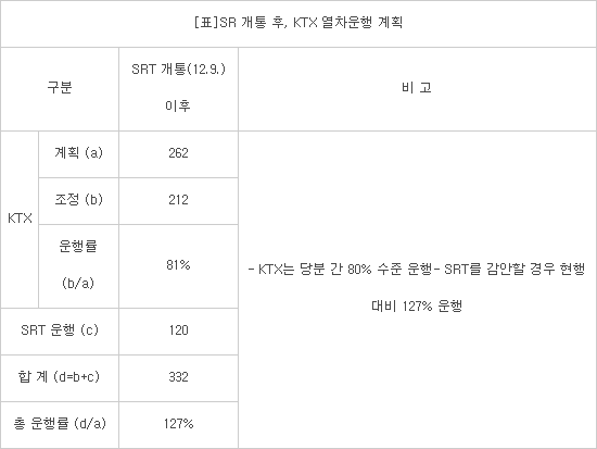 KTX 운행 횟수는 일부 감소하지만 9일부터 수서발 고속철도인 SRT가 개통되면 120회 고속열차가 추가 운행돼 총 운행률은 27%가 증가한다.