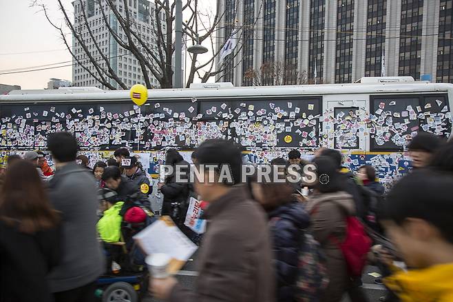 [ 펜타프레스 -2016/12/03 ] 3일 오후 서울 도심에서 벌어진 박근혜 대통령 퇴진 촉구 제6차 촛불집회에 참여한 시민들이 차벽 앞을 지나 광화문 광장으로 향하고 있다.