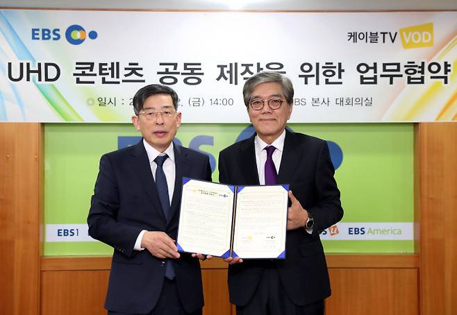케이블TV VOD와 EBS는 2일 EBS 본사 사무실에서 ‘초고화질(UHD) 방송 및 디지털 케이블TV VOD 서비스 협력을 위한 업무 협약’을 체결했다. 주요 협력 내용은 ▲UHD TV 콘텐츠 공동 제작 ▲ 디지털 케이블 TV의 EBS 교육?교양?다큐 콘텐츠 VOD 서비스 확대 ▲공익 사업 등 사회적 역할 공동 수행 등이다.