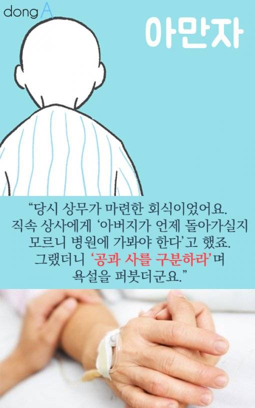 "당시 상무가 마련한 회식이었어요. 직속 상사에게 '아버지가 언제 돌아가실지