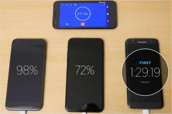 지난 10월 컴퓨터 하드웨어 전문매거진 'AnandTech'가 주요 스마트폰을 대상으로 충전에 소요되는 시간을 조사한 결과에서도 갤럭시S7엣지(3600mAh)는 1.85시간, 아이폰6s플러스(2750mAh)는 2.80시간이 걸렸다. 픽셀XL의 배터리양은 3450mAh로 아이폰6s플러스보다 700mAh 더 크다.