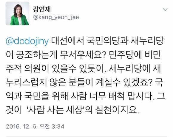 강 부대변인은 6일 오전 3시34분 자신의 SNS에 “대선에서 국민의당과 새누리당이 공조하는게 무서우세요?”라며 “민주당에 비민주적 의원이 있을 수 있듯, 새누리당에 새누리스럽지 않은 분들이 계실 수 있다”는 글을 게재했다.