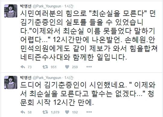 이날 박 의원은 트위터에 “시민의 힘으로 ‘최순실을 모른다’던 김기춘 증인의 실토를 들을 수 있었다”며 “손혜원, 안민석 의원에게도 같이 제보가 왔다. 힘을 합쳐 네티즌 수사대와 함께한 일이다”라고 적었다.