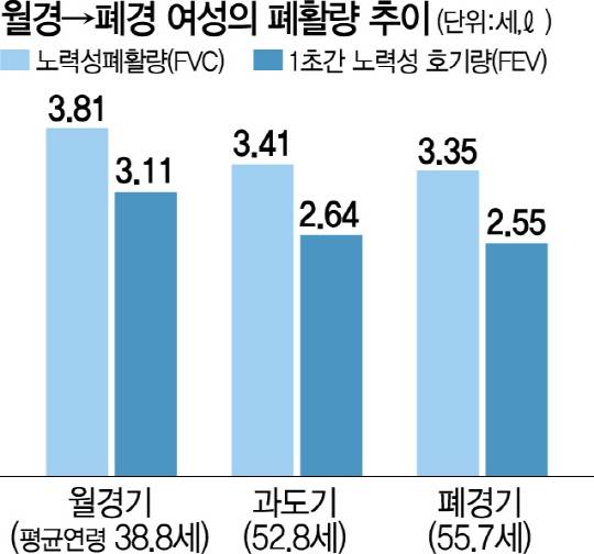 최대로 숨을 들이마신 뒤 끝까지 내쉰 날숨의 양을 뜻하는 ‘노력성 폐활량(FVC)’은 월경 중 여성(평균 39세)이 평균 3.81ℓ였는데 과도기(평균 53세)에는 3.41ℓ로 10.5%, 폐경기(평균 56세)에는 3.35ℓ로 12.1% 감소했다.