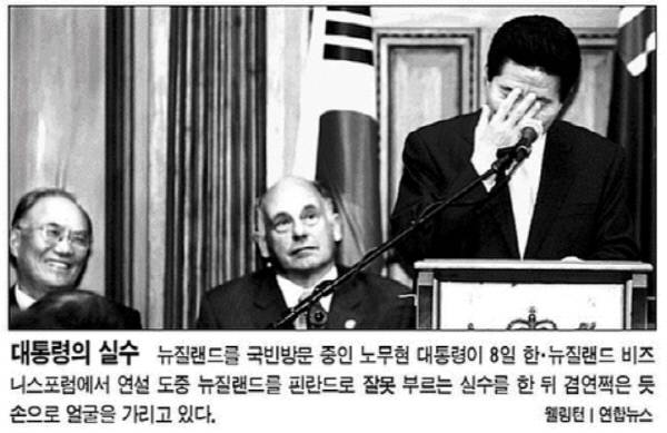 대통령도 우리와 마찬가지로 인간인지라 실수도 하는 법이죠. 10년 전 대통령이었던 노무현 전 대통령은 그런 점에서 인간적인 면모를 많이 보여준 대통령으로 꼽힙니다. 당시 뉴질랜드 순방 중이었던 노 전 대통령은 양국의 국빈들이 다 모여있는 자리에서 연설을 하다가 뉴질랜드를 핀란드라고 잘못 발언하는 실수를 저질렀습니다. 곧바로 실수를 알아차린 노 전 대통령은 사과를 하면서 부끄러웠는지 얼굴을 한 손으로 가리며 미안한 웃음을 지어보였습니다. 이 사진이 지금의 우리에게 주는 메시지는 남달라 보입니다. 대통령이든 누구든 실수는 다 하기 마련입니다만, 그 실수에 대해 미안해하는 자세와 사과의 한 마디를 보여주기란 참 쉽지 않은 일임을 새삼 깨닫는 요즘입니다.