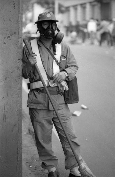 방독면을 쓰고 일에 지쳐 기대어 있는 청소부 아저씨, 매운 최루가스에 콧구멍을 종이로 틀어막은 근엄한 수녀님과 경찰 젊은이, 박종철 열사의 사진을 가슴에 달고 십자가를 한 손에 높이 들며 연신 눈물을 흘리는 명동성당 앞의 '박종철 어머니', 역촌동 가는 버스에서 창문을 열고 힘껏 박수를 치면서 시위 부대를 격려하는, 이를 앙다문 어떤 아저씨... 그는 민주화운동 현장에서도 보이는 것이 사람밖에 없는 모양이다. 사람에 웃고 울고, 천상 사람 앓이를 업으로 삼아야 하는 팔자일 것이다.