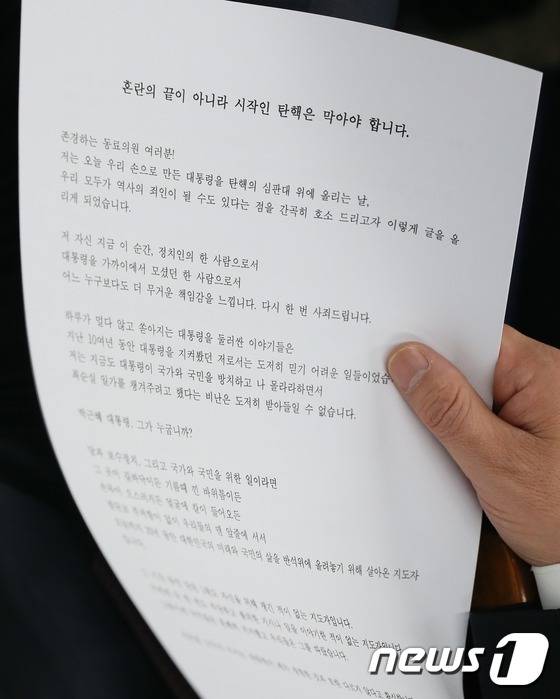 (서울=뉴스1) 송원영 기자 = 새누리당 한 의원이 9일 서울 여의도 국회에서 열린 의원총회에서 최경환 의원이 전달한 '탄핵 반대 호소문'을 읽고 있다. 국회는 이날 오후 3시 본회의에서 박근혜 대통령 탄핵소추안 표결을 진행한다. 2016.12.9/뉴스1
