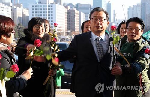 <탄핵표결> '탄핵찬성 꽃' 뿌리치는 이정현 대표