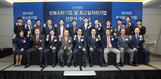 신용보증기금(이사장 황록·앞줄 가운데)은 9일 서울힐튼호텔에서 ‘2016년 신보 스타 기업 및 최고 일자리 기업 선정서 수여식’을 열었다. 신보는 매년 성장 가능성이 높고 일자리 창출에 기여한 우수 중소기업을 선정해 보증료 우대와 맞춤형 상담 등 금융·비금융 지원을 하고 있다.