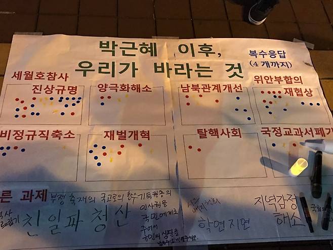 | ▲ 박근혜 퇴진 나고야 4차 집회 '박근혜 이후 우리가 바라는 것'스티커 설문조사 |