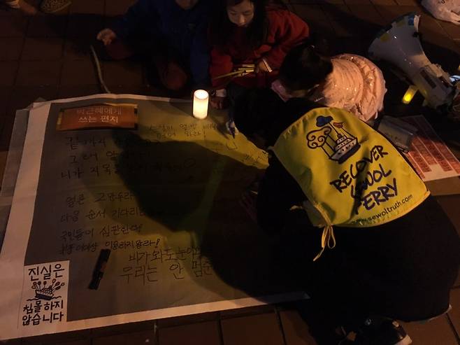 '박근혜에게 보내는 편지'에는 '비가 와도 눈이 와도 우리는 안 멈춘다', '순실이 옆방 비워놓았다. 어여 와라', '어디로 가든 김기춘, 우병우, 이완영, 이정현 세트로 가 주세요. please~' 등의 내용을 담았습니다. 굳은 의지와 풍자로 각자의 마음을 표현했습니다.
