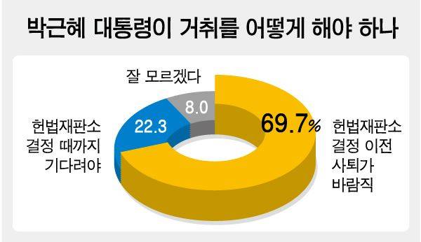 한국일보가 한국리서치에 의뢰해 9, 10일 양일 간 실시한 여론조사 결과, 탄핵 가결 이후 박 대통령의 거취와 관련해 “헌재 결정 이전에 사퇴하는 것이 바람직하다”는 응답은 69.7%였다. “헌재의 결정이 날 때까지 기다려야 한다”는 22.3%에 불과했다.