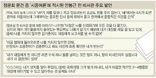시중여론은 ‘문고리 3인방’의 한 명인 안 전 비서관이 비공개 자리에서 측근 권력을 은근히 과시한 정황을 보여준다.