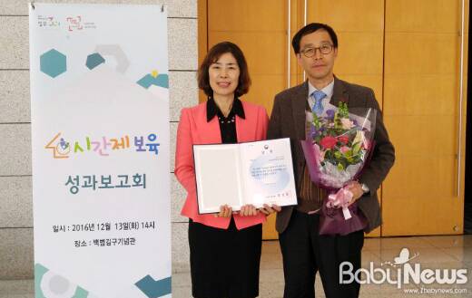 수원시육아종합지원센터가 보건복지부가 주관하는 2016년 시간제 보육사업 성과보고회에서 시간제보육 운영 우수사례 부문 보건복지부 장관상을 받았다. 사진 왼쪽부터 한은숙 수원시육아종합지원센터장, 백광학 수원시 보육아동과장. ⓒ수원시 |