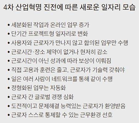 4차 산업혁명 시대 노동 보고서 근무시간·임금 정비례 시대 끝나 감성·사회적 스킬 필요한 일 늘어 기계가 일자리 대체하면 인력 과잉 여성·반퇴세대 지원, 외국인력 관리 정규·비정규직 이중구조 해소해야