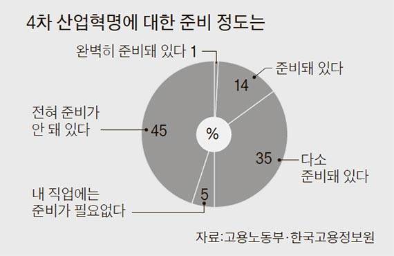 흔히 인공지능(AI)의 시대로 일컬어지는 4차 산업혁명이 경제 전반에 빠르고 광범위하게 퍼지고 있다. 제조업과 정보통신기술(ICT)의 융합을 통해 생산·유통 방식이 확 바뀌면서 고용시장도 변화의 소용돌이에 휩싸였다. 금융·보험회사에 근무하는 직장인의 82%는 “4차 산업혁명이 일자리를 감소시킬 것”이라고 걱정한다. 한국고용정보원이 올해 7월 직업별로 1006명을 조사한 결과다. 나머지 직군에서도 두 명 중 한 명은 일자리가 줄 것이라고 응답했다. 근로시간만 채우면 임금을 받는 기존 고용시장의 형태가 업무의 강도와 수행 정도에 따라 대가를 지불하는 형태로 바뀌고, 그나마 기계로 대체되는데 따른 현상이다.
