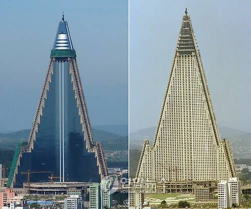 그러나 1992년 자금난과 건설자재·장비 부족 등으로 공사가 중단됐다. 외부 골조만 올린 상태에서 장기간 흉물로 방치되면서 외부인들로부터 '실패한 북한의 상징물' '지상 최대의 쓰레기'란 오명을 받기도 했다.