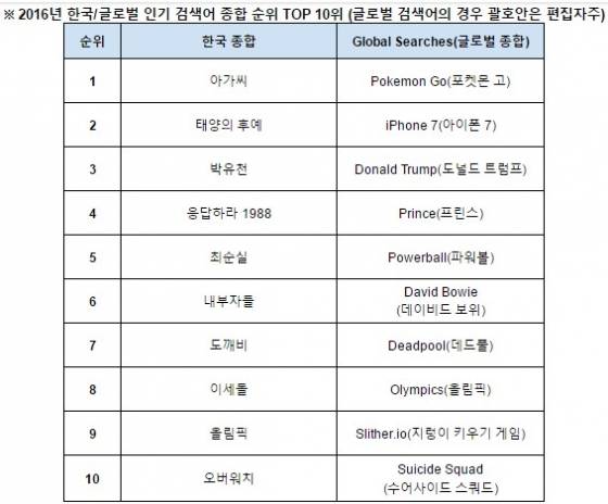 국내에서는 한류 콘텐츠 관련 검색어가 상위권에 올랐다. '아가씨'에 이어 드라마 '태양의 후예', 성추문 논란을 일으킨 가수 겸 배우 '박유천', 드라마 '응답하라 1988', 영화 '내부자들' 등이 인기 검색어로 꼽혔다.
