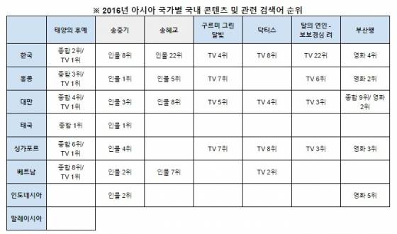 한류 콘텐츠는 국내뿐 아니라 홍콩, 대만, 태국 등 동남아시아 주요 검색어 순위에서도 최상위권에 올랐다. '태양의 후예'는 한국과 홍콩, 대만, 싱가포르, 베트남 TV 순위에서 1위를 차지했다. '태양의 후예' 주연배우 '송중기'와 '송혜교' 역시 이들 국가의 인물 순위 최상위권을 기록했다.