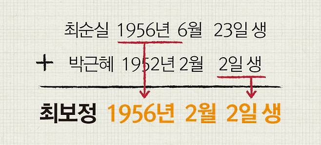 박 대통령의 생년월일이 1952년 2월 2일입니다. 56년생인 최 씨와 2월 2일생인 박 대통령을 합쳐 최보정이란 가공인물을 만든 것 아니냐는 의혹이 제기된 겁니다.