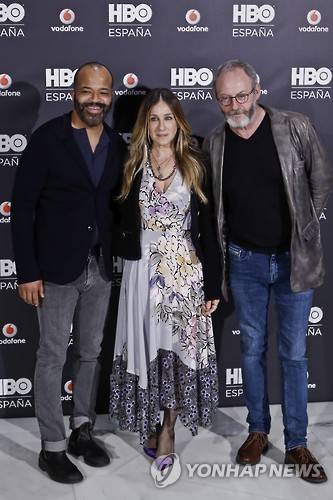 epa05676713 US actors Jeffrey Wright (L) and Sarah Jessica Parker (C) and Irish actor Liam Cunningham (R) pose during the presentation of HBO Spain TV channel in Madrid, Spain, 15 December 2016. EPA/EMILIO NARANJO
