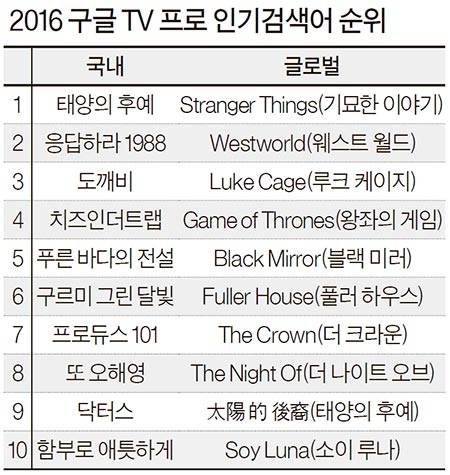 국내 TV분야 1위 역시 ‘태양의 후예’였다. 2위는 복고 열풍과 함께 박보검 같은 스타를 배출한 ‘응답하라 1988’. 박보검이 주연한 ‘구르미 그린 달빛’도 6위에 올랐다. ‘프로듀스 101’(7위)은 드라마 아닌 TV프로로 유일하게 10위 안에 들었다.