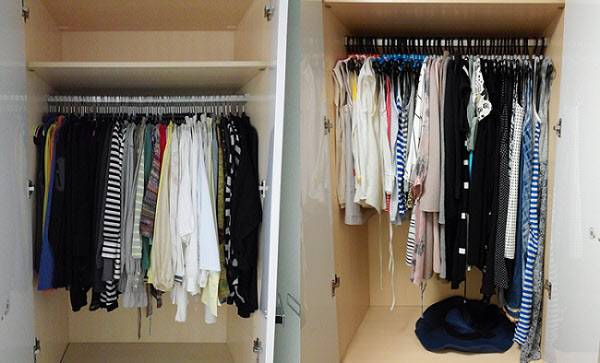 옷걸이를 얇은 논슬립 옷걸이로 통일하면 많은 양의 옷을 걸 수 있다. 무거운 아우터는 옷걸이를 여러개 겹쳐서 쓴다. 셔츠처럼 단추가 있는 옷은 위 단추 두개를 잠그고, 옷걸이는 반드시 한 방향으로 건다. 길이가 가장 긴 순서대로, 소재별로 걸면 찾기도 쉽고 정돈되어 보인다.