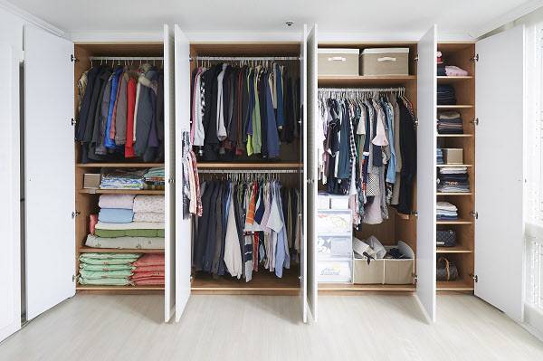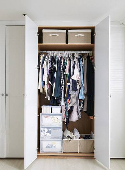 옷장 한 칸, 또는 행거 한 칸이라도 가족 구성원 별로 구간을 정한다. 안 입는 옷을 최대한 비우고 사계절 옷은 한 공간에 보관한다. 이렇게 해두면 계절이 바뀔 때마다 정리할 필요가 없다. 요즘은 간절기가 짧고, 옷을 겹쳐 입기 때문에 따로 보관할 필요가 없다.