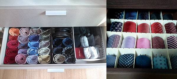 넥타이는 전용 걸이에 걸거나 돌돌 말아서 칸칸 바구니에 넣는다. 주름이 많은 스카프도 돌돌 말아서 끝 부분을 중신에 콕 넣어주면 흐트러지지 않는다. 벨트 역시 돌돌 말아서 고무줄로 묶어 주고 바구니에 담아준다.