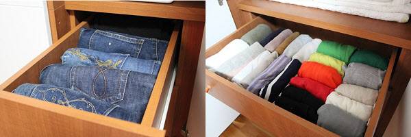 옷을 개는 방법은 다양하나, 원칙은 세울 수 있게 접는 것이다. 바구니나 서랍의 크기에 맞게 똑같은 크기로 개고, 지저분한 부분이 안쪽으로 가도록 네모 반듯하게 접는다. 서랍 또는 바구니에 세로 수납한다. 바지는 주머니가 보이게 접는다.