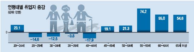 이에 비해 45세 이상의 중년 및 고령층 취업자는 급속한 증가세를 보였다. 특히 베이비붐 세대로 본격 은퇴 시기에 이른 55~64세 취업자가 130만명 가까이 늘었다. 최근 5년 동안 55~59세 취업자가 74만1900명 늘어나 증가규모가 가장 컸고, 60~64세 취업자도 54만9700명 늘었다. 이어 65세 이상(54만6100명), 50~54세(21만3000명), 45~49세(19만1100명)의 순으로 증가규모가 많았다.