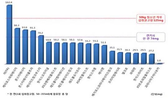 제품별 한 캔(1회 섭취참고량) 당 카페인 함량은 최소 1.0mg ~ 최대 162.4mg 으로 차이가 있었으며, 그 중에서 삼성제약의 '야(YA)'가 162.4mg으로 가장 높았다. 이는 식약처가 권고하는 청소년 하루 섭취 권고량인 125mg을 초과하는 수치다.