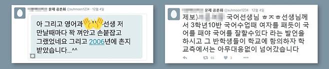 특히 경찰 수사 대상 중 한 명인 정모 교사의 경우 지난 8월 해임됐다. 학교 관계자는 "정 교사가 이전에도 성희롱으로 문제가 돼 3개월 정직 처분을 받았는데 복직하자마자 또 비슷한 일을 저질렀다"며 "트위터 폭로전 이후 교사들을 대상으로 성범죄 예방 교육을 진행했다"고 말했다.