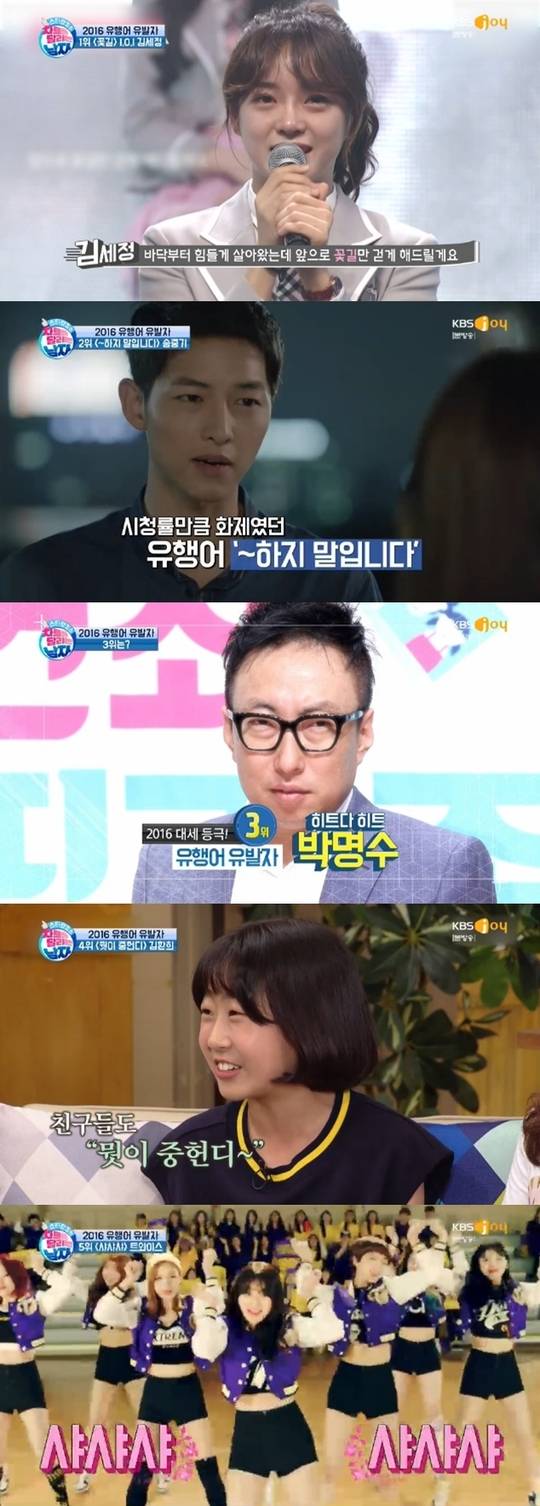 1위는 서바이벌프로그램에서 ‘꽃길만 걷자’란 말을 해 ‘꽃길’이란 단어를 유행시킨 아이오아이-구구단의 김세정이 차지했다. 이 단어는 김세정의 첫 솔로곡 제목이 되기도 했다. 2위는 올해 최고의 인기드라마 ‘태양의 후예’에 출연한 송중기로, 그는 해당 드라마에서 ‘~하지 말입니다’라는 군대 말투로 많은 사랑을 받았다. 이어 공개된 3위는 ‘무한도전’에서 탄생한 박명수의 ‘히트다 히트’였다.
