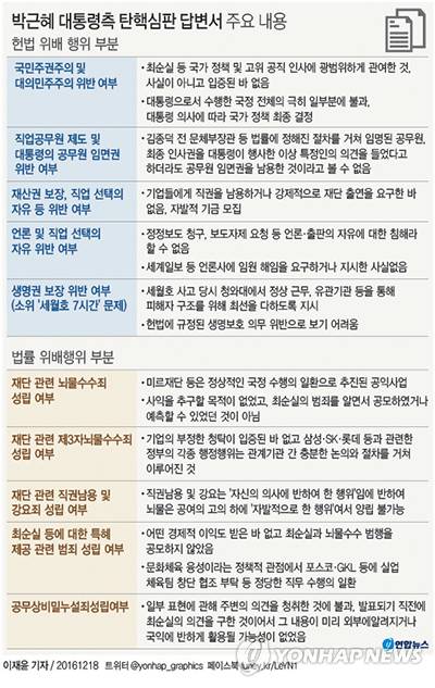 ◇ "언론, 질풍노도 시기에 폭로성 의혹 남발…최순실 의혹은 국정의 1% 미만" = 박 대통령측은 최순실 씨의 국정농단 의혹을 부인하면서 "언론에 제기된 의혹 대부분은 '미르·K재단, 최순실 이권 사업' 등에 국한돼 있다. 이는 대통령으로서 수행한 국정 전체의 극히 일부분"이라며 "대통령의 국정수행 총량 대비 최순실 등의 관여비율을 계량화하면 1% 미만이 된다"고 밝혔다.