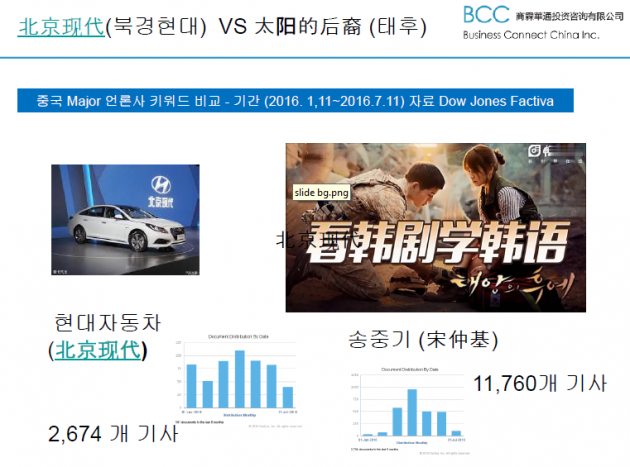 글로벌 유료 언론검색 솔루션인 팩티바(Factiva)에서 지난 2016년 1월부터 7월까지 6개월 간 한국기업과 한류스타 키워드를 분석했다. 예를 들면 北京现代(북경현대자동차) VS 太阳的后裔 (태후 - 태양의후예)를 비교했을때 현대자동차의 중국 유력매체 언론노출 기사는 2,674개에 불과했지만 '태양의후예' 주인공인 송중기는 11,760개의 기사가 언론에 노출된 것으로 나타났다.
