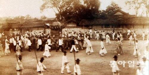 | 1897년 11월 21일 명성황후 장례식 행렬 중 신주를 모신 가마가 지나는 모습. 장례식은 명성황후가 1895년 10월 8일 시해되고 2년여가 지나 고종이 대한제국을 선포한 뒤 열렸다. 동아일보DB |