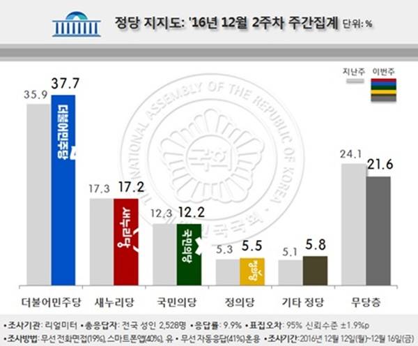 이번 조사는 12월 12~16일까지 5일간 전국 19세 이상 유권자 2천528명을 대상으로 무선 전화면접(19%), 스마트폰앱(40%), 무선(26%)·유선(15%) 자동응답 혼용 방식으로 무선전화(85%)와 유선전화(15%) 병행 임의걸기(RDD, random digit dialing) 및 임의스마트폰알림(RDSP, random digit smartphone-pushing) 방법으로 조사했다. 응답률은 전체 9.9%로 통계보정은 2016년 6월말 행정자치부 주민등록 인구통계 기준 성, 연령, 권역별 가중치 부여 방식으로 이루어졌다. 표본오차는 95% 신뢰수준에서 ±1.9%p다. 자세한 조사개요와 결과는 중앙선거여론조사공정심의위원회 홈페이지(http://www.nesdc.go.kr)를 참고하면 된다.