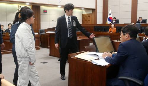 | 피고인석 향하는 최순실 국정 농단 사태의 핵심인 최순실 씨(수의 입은 사람)가 19일 서울 서초구 서울중앙지법 417호 법정에 들어와 피고인석으로 걸어가고 있다. 이날 재판부는 사건의 중요성을 감안해 개정 전까지 취재진의 법정 촬영을 허가했다. 사진공동취재단 |
