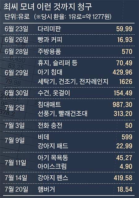 중앙일보가 확인한 최씨 모녀의 지출 내역서에는 커피(2.1유로, 약 2700원). 아이스크림(4.9유로) 구입 비용까지 기록돼 있다. 애완견용 패드(배변판)와 펜스(울타리), 아기목욕통도 목록에 포함돼 있다. A씨는 “지난해 연말 삼성전자에 보내는 첫 경비 청구서를 보냈다. 지난해 5월부터 자신들이 사용한 모든 비용을 합산해 81만 유로(약 10억원)를 청구했는데 삼성 측에서 비용에 대한 질문을 한 번도 하지 않고 모두 지급해 놀랐다”고 기억했다.