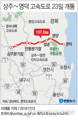 (세종=연합뉴스) 윤보람 기자 = 경북 상주시와 영덕군을 연결하는 상주∼영덕 고속도로(총연장 107.6㎞)가 23일 오후 6시 개통한다고 국토교통부가 22일 밝혔다.