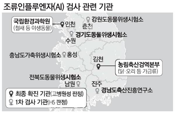 22일 환경부 농식품부와 각 지자체에 따르면 지난달 정부는 부처 간 협의를 통해 야생조류의 AI는 인천 소재 환경부 산하 국립환경과학원에서, 농장 가금류의 AI는 경북 김천의 농림축산검역본부에서 각각 최종 확진 판정을 내리도록 결정했다.