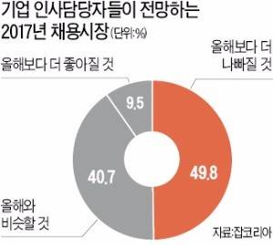 취업포털 잡코리아가 국내 기업 인사담당자 717명을 대상으로 ‘2017년 새해 채용시장 전망’을 조사한 결과 기업 인사담당자의 49.8%는 “내년 채용경기가 올해보다 나빠질 것”으로 내다봤다. 올해와 비슷할 것이란 응답은 40.7%였다.