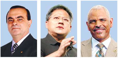 | CES 2017에서 기조연설을 맡은 카를로스 곤 르노닛산 얼라이언스 회장, 젠슨 황 엔비디아 CEO, 아널드 도널드 카니발 코퍼레이션 CEO (왼쪽부터). |