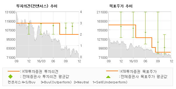 | 오늘 KTB투자증권에서 발표된 'HOLD'의견 및 목표주가 85,000원은 전체의견을 소폭 하회하는 수준으로 동종목에 대한 기대감을 다소 약하게 표현한 것으로 풀이되며 목표가평균 대비 14.6%정도 미달하고 있는 것으로 집계되었다. 참고로 최근에 목표주가를 가장 공격적으로 제시한 하나금융투자에서 투자의견 '매수'에 목표주가 140,000원을 제일 보수적인 의견을 제시한 삼성증권에서 투자의견 'HOLD'에 목표주가 80,000원을 제시한 바 있다. |