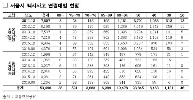 28일 서울시에 따르면 시내 개인택시 교통사고 중 고령자가 차지하는 비중은 2011년 26.3%(527건)에서 올해 8월까지 41.6%(526건)으로 15.3%포인트 높아졌다. 개인택시 65세 이상 운전자 비중(35%)보다 사고율이 더 높다. 서울시는 운행거리별 사고율은 고령 택시기사가 현저히 높다고 덧붙였다.